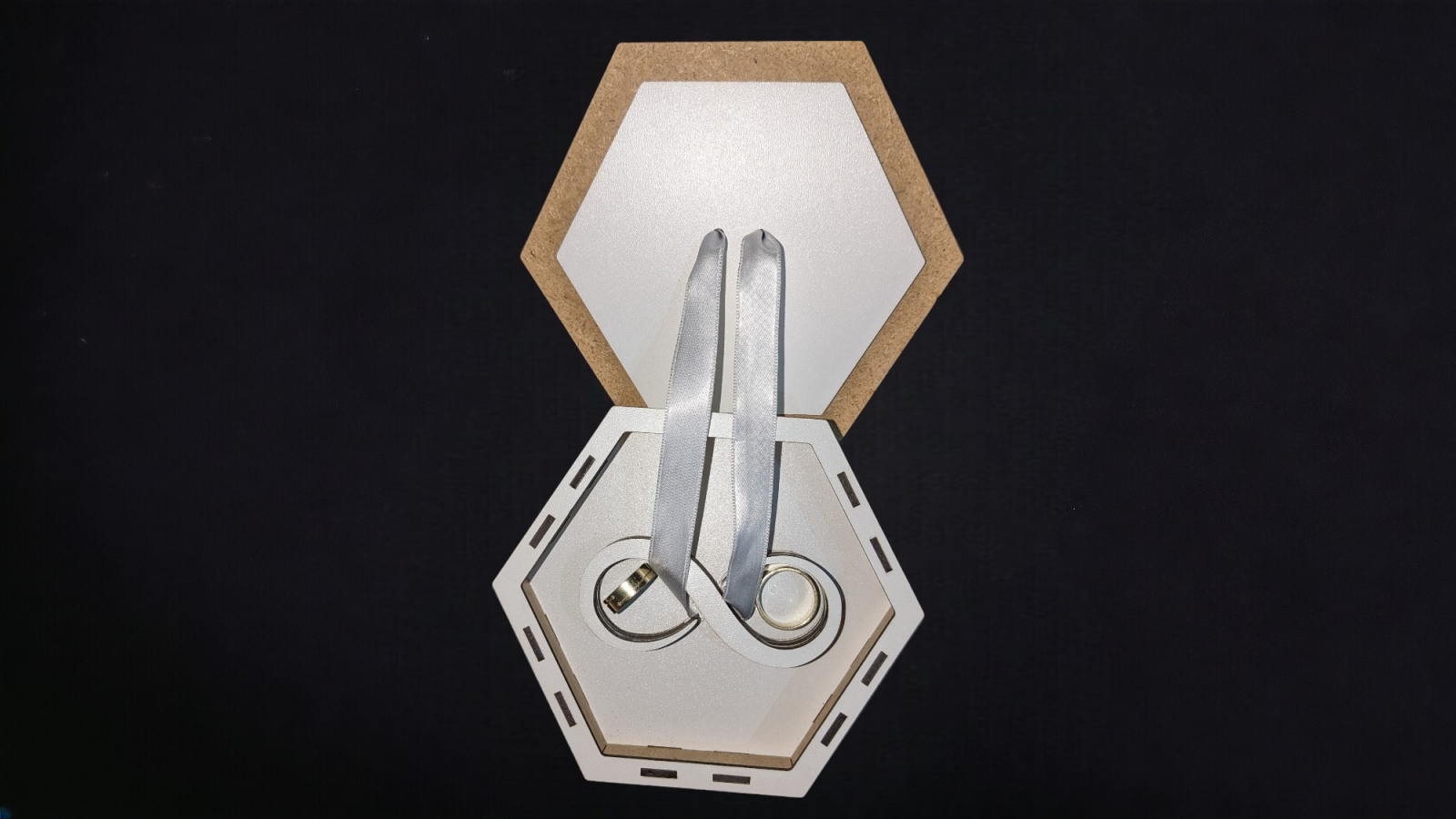 Realizată cu atenție la detalii și cu o atingere de eleganță, această cutie hexagonală din MDF oferă un fundal perfect pentru bijuteriile voastre prețioase. Materialele de înaltă calitate și finisajul impecabil completează designul modern al cutiei, evidențiind importanța acestor simboluri ale iubirii. Cu spațiu suficient pentru a găzdui verighetele într-un mod sigur și frumos expus, cutia devine un element de neuitat în cadrul evenimentului vostru special.